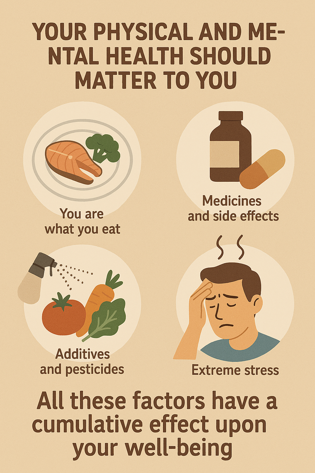 Your physical and mental health should matter to you. A lot of people believe ‘you are what you eat’ but what about the medicines you take and their side effects. The same also applies to food regarding additives put in food and pesticides sprayed on crops or vegetables. Extreme stress is also harmful to human beings whether it is financial, abusive, living conditions, caring for loved ones or loneliness. All these this attributes have an accumulative effect upon the person’s well-being.